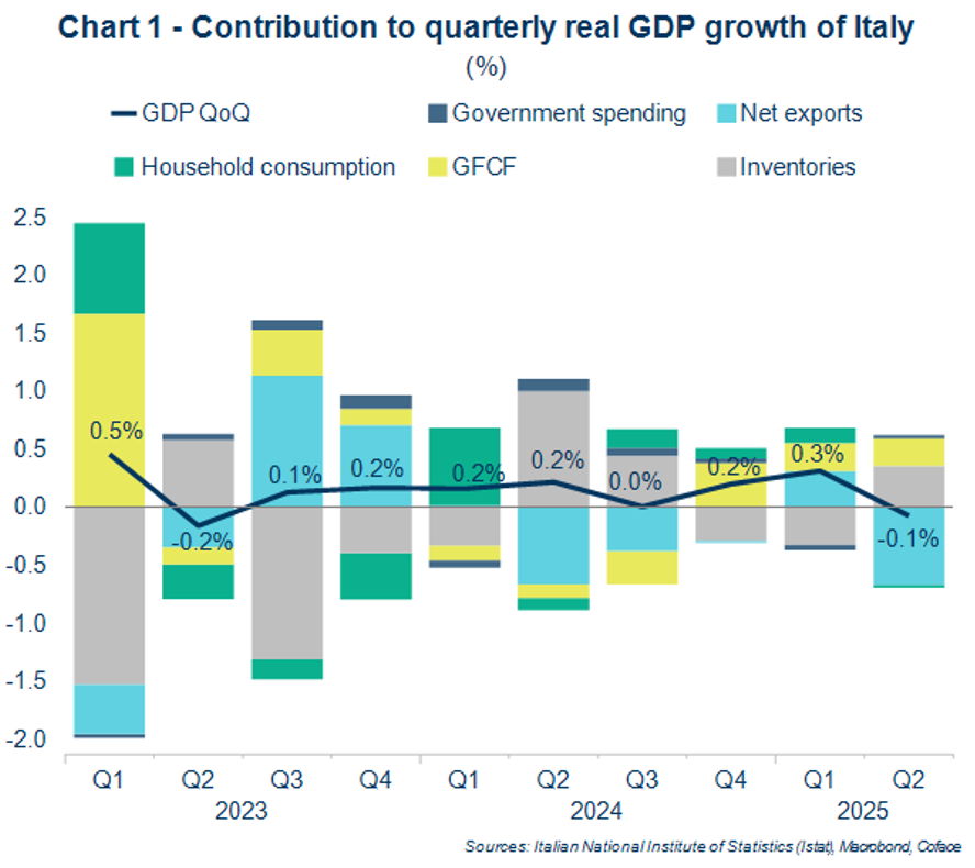 V drugem četrtletju 2025 se je italijanski BDP v primerjavi s prejšnjim četrtletjem zmanjšal za 0,1 %, kar je prvo krčenje v zadnjih dveh letih in potrjuje krhkost gospodarske rasti. Italija je raven BDP iz obdobja pred krizo leta 2008 dosegla šele konec leta 2024. Glavni razlog za upad je zmanjšanje zunanjega povpraševanja, ki je posledica šibkosti glavnih trgovinskih partnerjev in geopolitičnih negotovosti. Izvoz blaga se je v drugem četrtletju zmanjšal za 2,2 %, potem ko je pred tem začasno poskočil zaradi pričakovanja novih ameriških carin. Hkrati ostaja potrošnja gospodinjstev šibka, saj jo zavirata nizka potrošniška samozavest in kupna moč, ki se kljub stabilizaciji inflacije še vedno težko pobira.