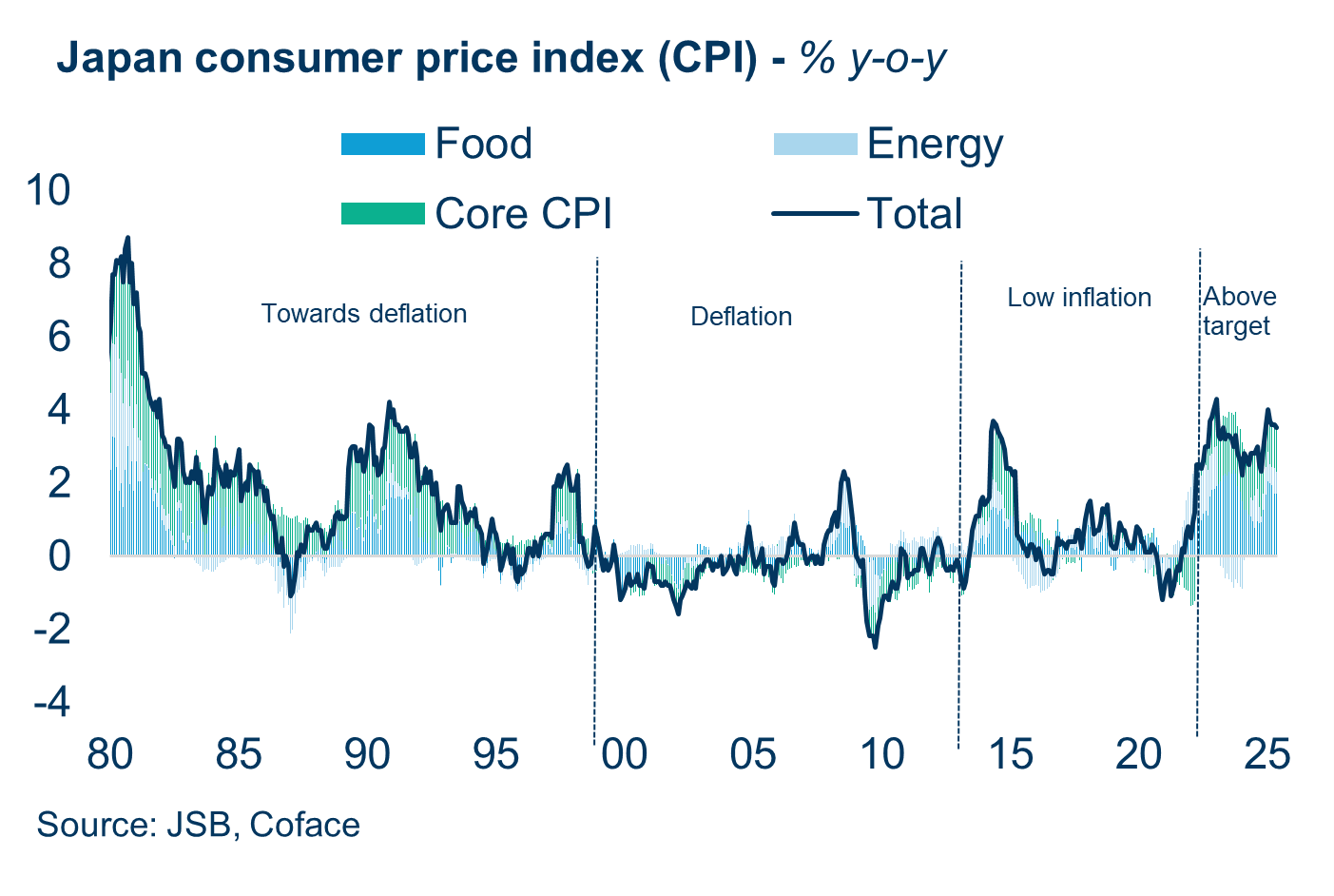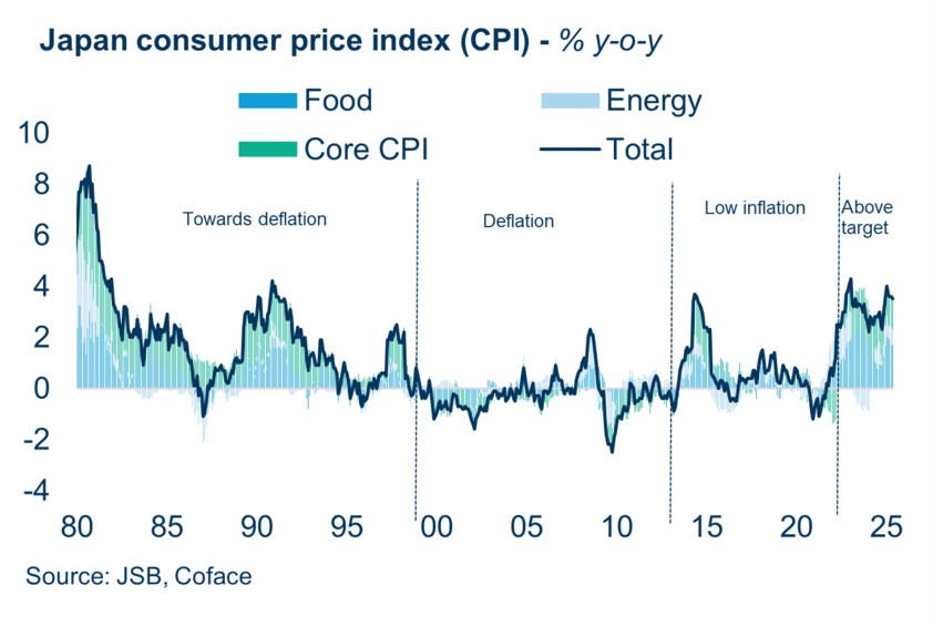 V zadnjih tridesetih letih so se občasno pojavili inflacijski sunki, ki so bili večinoma posledica začasnih šokov, kot so skokovite podražitve nafte ali zvišanje davka na potrošnjo, vendar brez trajnega vpliva domačega povpraševanja. To se je spremenilo leta 2022, ko je inflacija vztrajno presegala 2-odstotni cilj japonske centralne banke, sprva zaradi višjih stroškov uvoza in padca vrednosti jena.