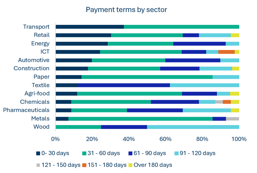 Po sektorjih so najbolj velikodušni glede plačilnih rokov lesna industrija, tekstil in farmacija, medtem ko je prometni sektor bolj restriktiven.