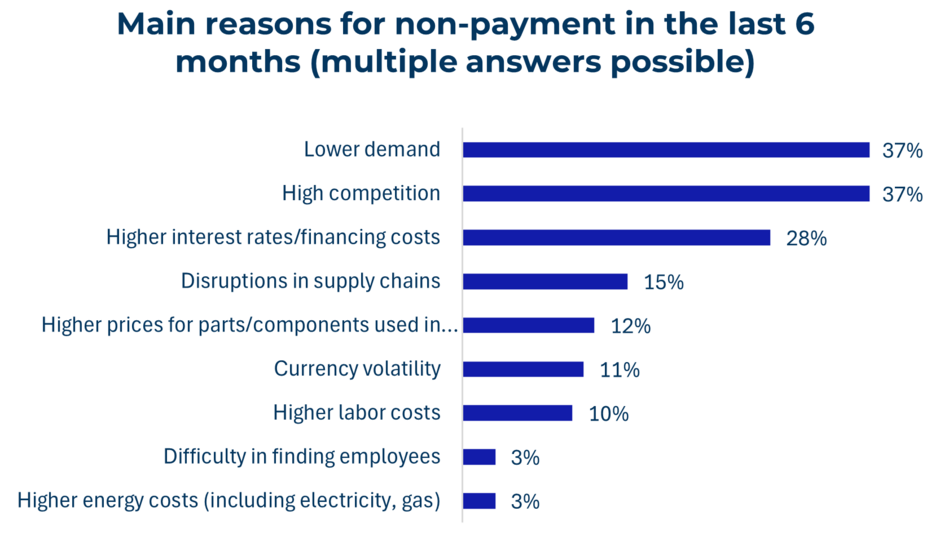 Argentina in Čile imata najkrajše povprečne zamude (26–27 dni), medtem ko Ekvador beleži povprečje 70 dni. Najpogosteje navedeni razlogi so šibko povpraševanje in pritisk konkurence (vsak po 37 %), sledijo visoki stroški financiranja (28 %). Strogi kreditni pogoji, zlasti v Braziliji in Kolumbiji, omejujejo sposobnost podjetij za financiranje tekočega poslovanja, kar povečuje izpostavljenost zamudam. Dodatne ovire predstavljajo nihanja valut, spremembe trgovinske politike in naraščajoči stroški dela.