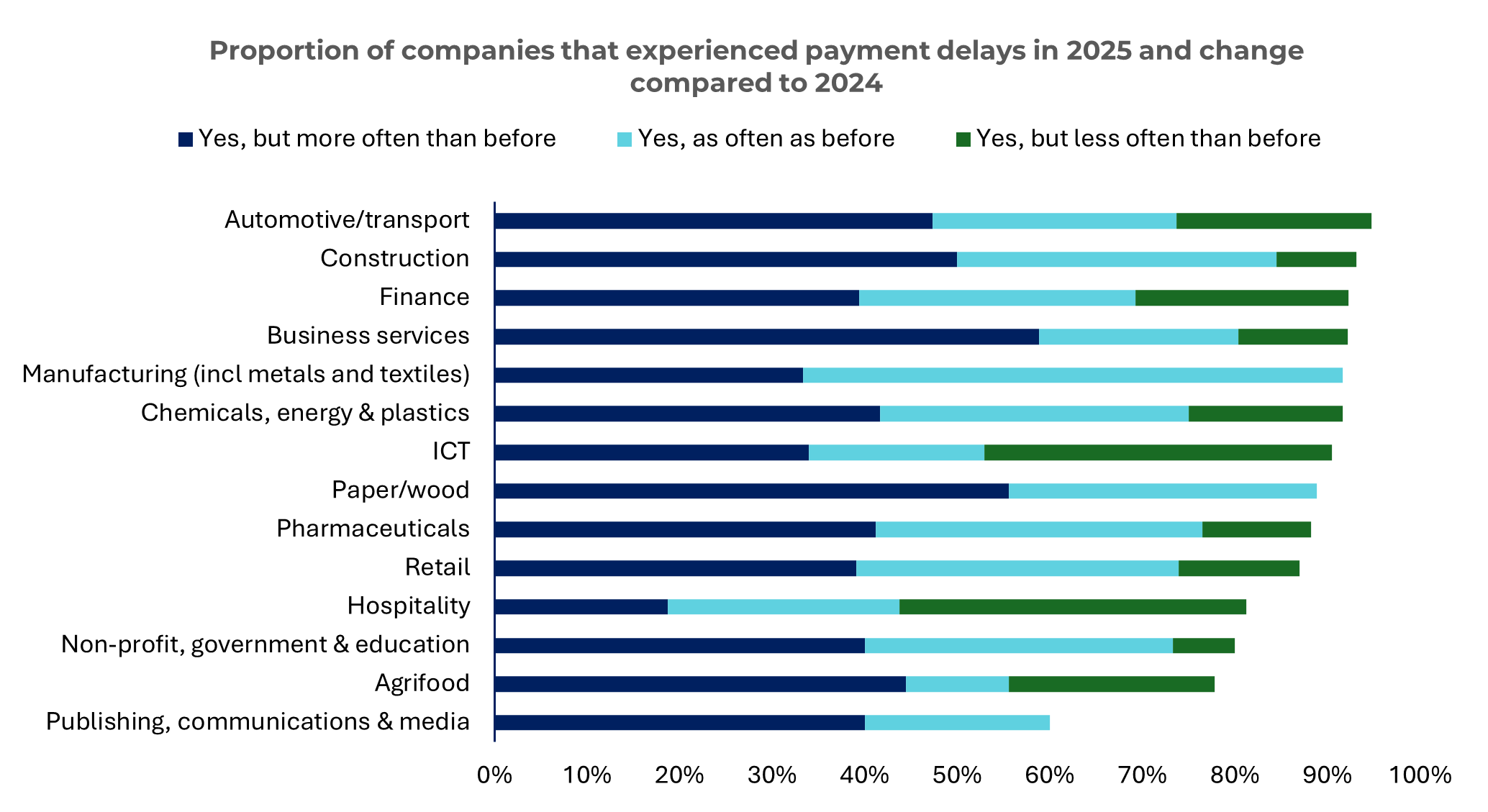 Gradbeništvo ter avtomobilska in transportna industrija so med najbolj prizadetimi zaradi naraščajočih zamud pri plačilih (95 % in 93 % podjetij), medtem ko se v založništvu, komunikacijah in medijih (60 %), agroživilski industriji (78 %) ter v javnem sektorju, izobraževanju in nevladnih organizacijah (78 %) pojavlja manj težav. Razlog za to so pogosto daljši plačilni roki ali boljša plačilna disciplina kupcev.