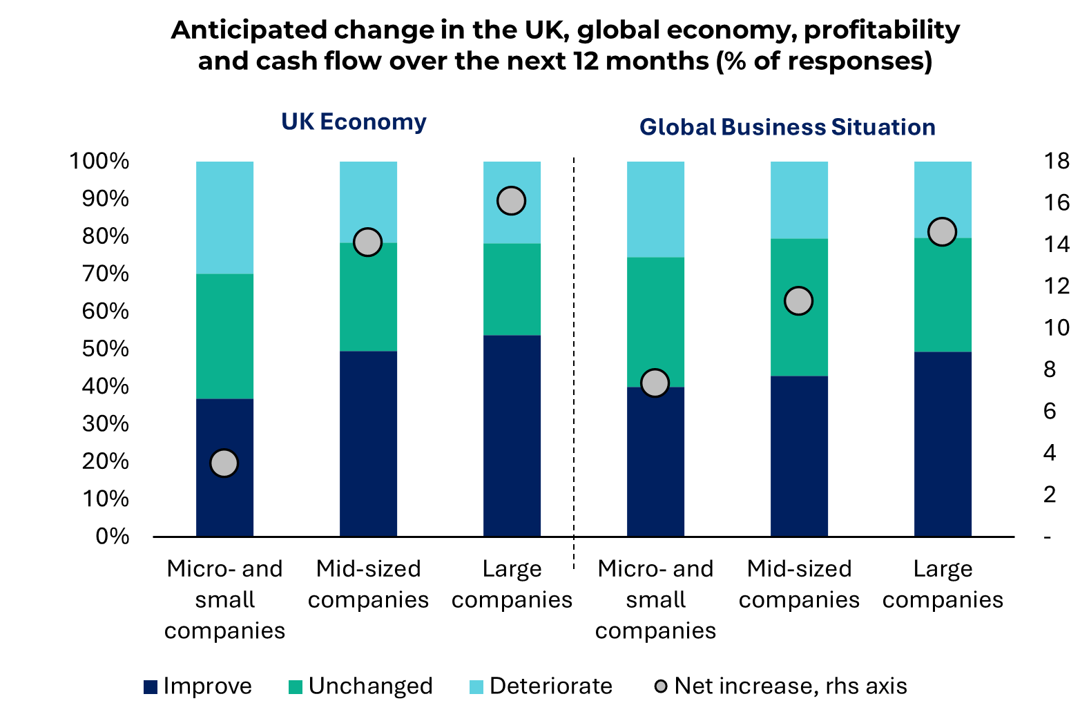 Kljub trenutnim izzivom se pojavljajo znaki upanja. Več kot tretjina podjetij pričakuje, da se bodo zamude pri plačilih v letu 2026 zmanjšale, kar temelji na izboljšanem gospodarskem razpoloženju ter pričakovanjih glede večje dobičkonosnosti in boljše likvidnosti. A optimizem ni enakomerno razporejen – mikro in mala podjetja ostajajo bolj skeptična: 66 % jih meni, da se bo britansko gospodarstvo v letu 2026 poslabšalo ali ostalo nespremenjeno. Poleg tega se številni sektorji še naprej soočajo s strukturnimi tveganji, kot so nihanje obrestnih mer, kibernetske grožnje in motnje v dobavnih verigah.